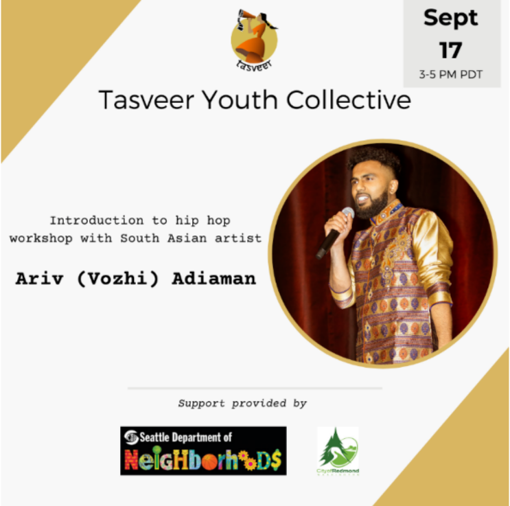 Tasveer Youth Collective presents Introduction to Hip Hop Tasveer Youth Collective is excited to invite youth (11-21 years of age, older ages welcome too) to participate in a Virtual Introduction to Hip Hop workshop. Led